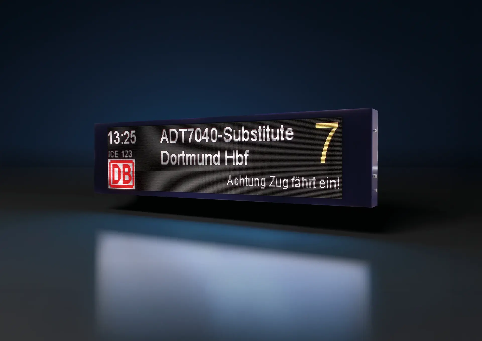 Ein Beispiel hierfür ist unser 1:1 LED-Ersatz für das bisher in Zugzielanzeigern eingesetzte 64×96-Dot LCD-Glas. Dieses neue LED-Modul ermöglicht sowohl die Fortführung laufender Projekte als auch die nachhaltige Weiterverwendung bestehender Bahnsteiginfrastrukturen